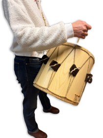 Instrument à double peaux (dont l’inférieure comporte un timbre réglable), ce tambour se tient d’une main ou sous le bras, par poignée en corde tressée (ainsi l’instrumentiste peut également jouer une flûte dite “à une main” type galoubet…).