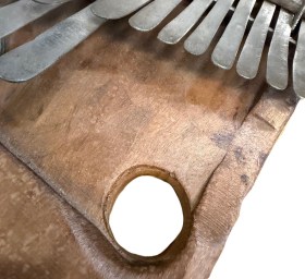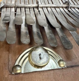 Cette sanza, aussi appelée mbira ou kalimba, est un instrument de musique traditionnel du Zimbabwe et dans les cultures shona, où il est parfois considéré comme un piano à pouces. Il fait partie de la famille des lamellophones : des idiophones à lames métalliques que l’on pince avec les doigts pour produire des sons clairs, mélodiques et percussifs.
